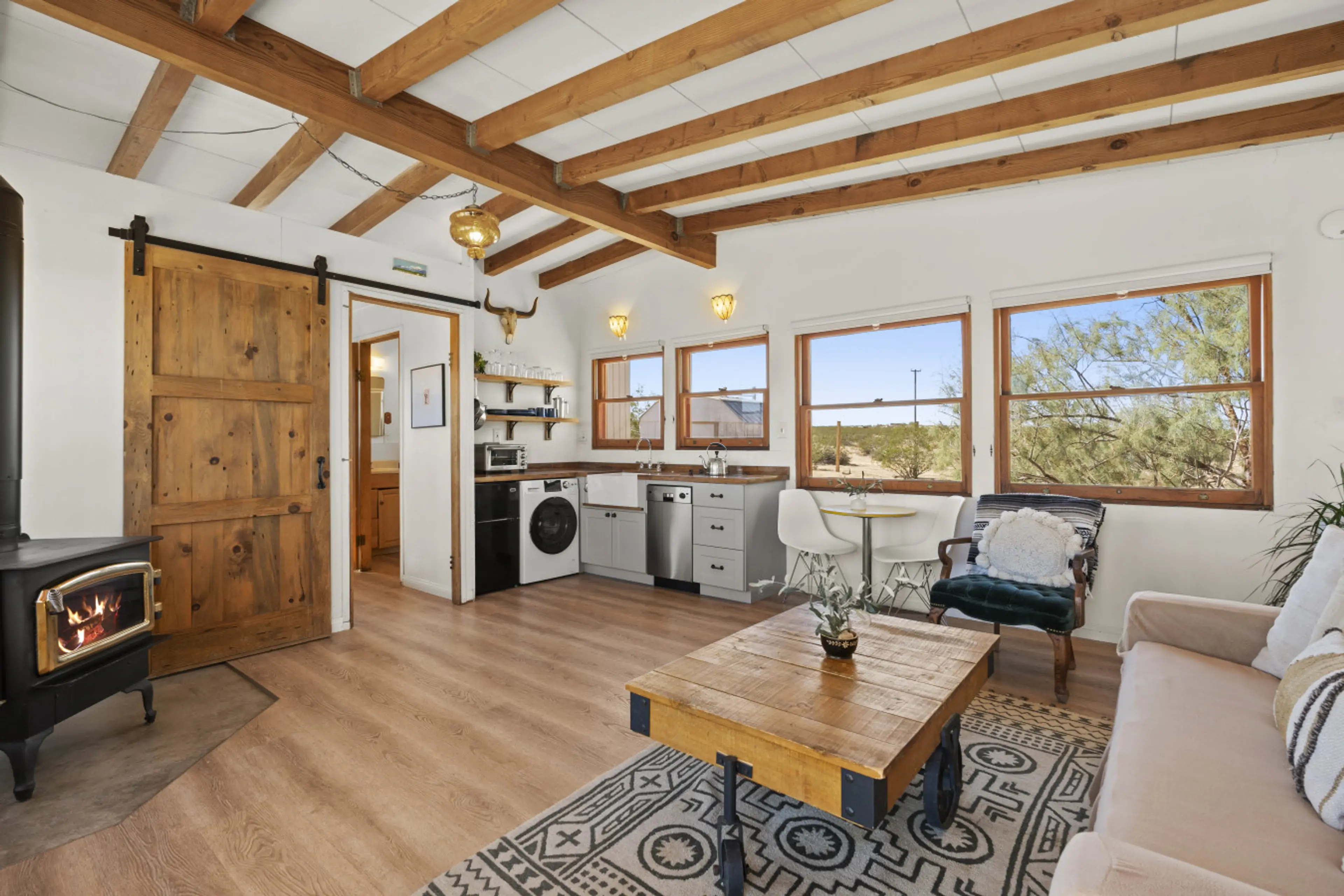Cozy, remote and quiet. Beautiful views of the sky and desert. It is a little buggie but it was manageable, it is a cabin after all. The outdoor seating was so nice to sky watch at night. Everything we needed was provided, blankets, kitchen utensils, mini fridge, water kettle, etc. Very nice stay and will come back. Thank you!